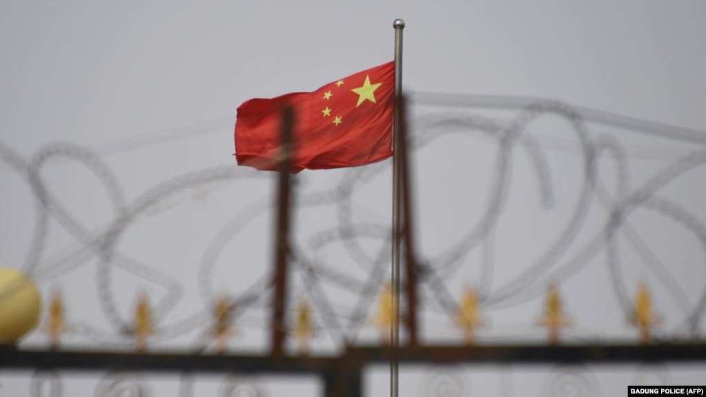 资料照:新疆喀什一处居住设施上的铁丝网和中国国旗(2019年6月4日)特朗普政府星期二(1月19日)宣布,中国在新疆对维吾尔人犯下了种族灭族和反人类罪。