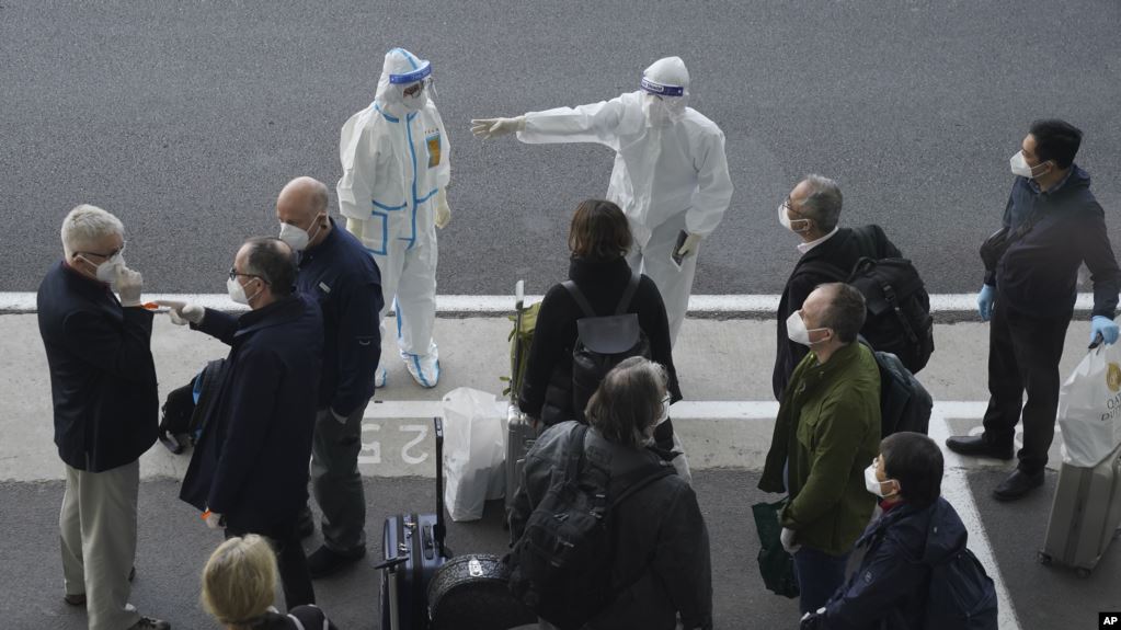 调查新冠病毒源头的世卫专家们抵达武汉天河国际机场,身穿防护服的中国工作人员给他们指方向。(2021年1月14日-美联社)分享