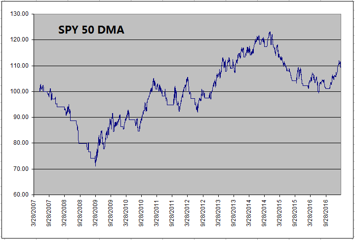 如果用SPY作为标的物,在50天均线上买入持有,下破50天均线卖出,10年资金曲线图: