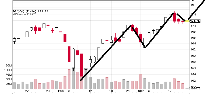 QQQ可能的走法大致符合“牛旗”形态,只有当后面的走法将要出现Lowerlow的情况时,趋势才会逆转: