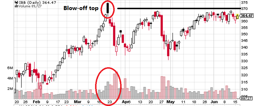 一个半月之前,俺即时标出了美股中的龙头股AAPL和之前的龙头板块BIOTECH的Blow-offtop形态: