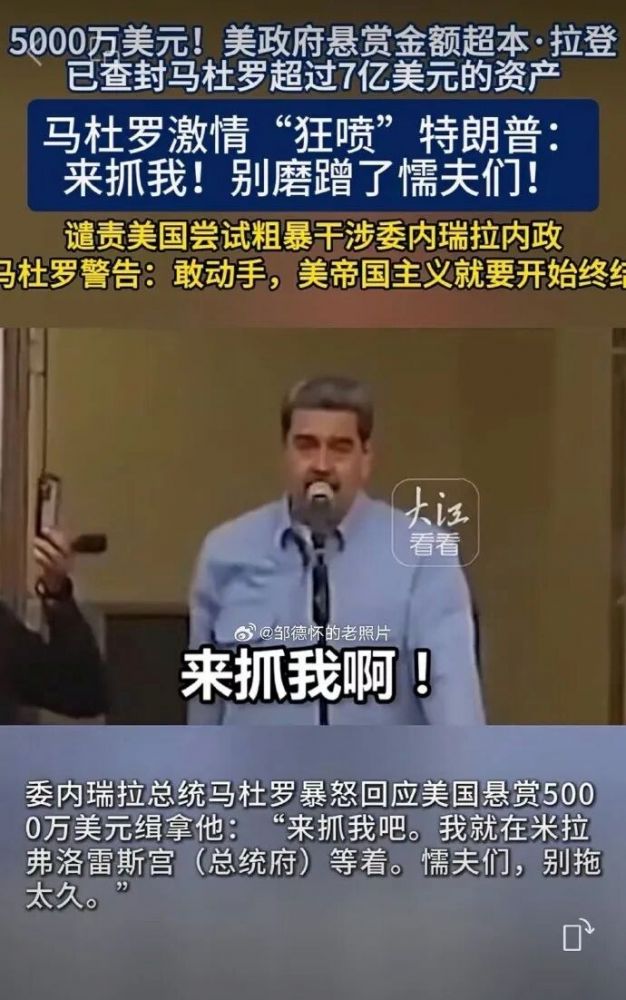 中国带路党:中国代表团前脚刚走,六个小时后马杜罗就被抓。马杜罗颂扬当天与习近平特使、中国拉美事务代表邱小琪的三个小时的会晤非常愉快,盛赞两国兄弟般的牢固情谊与友谊,称习近平是兄长。两国首脑刚拜完兄弟,小弟就被抓。兄长情何以[