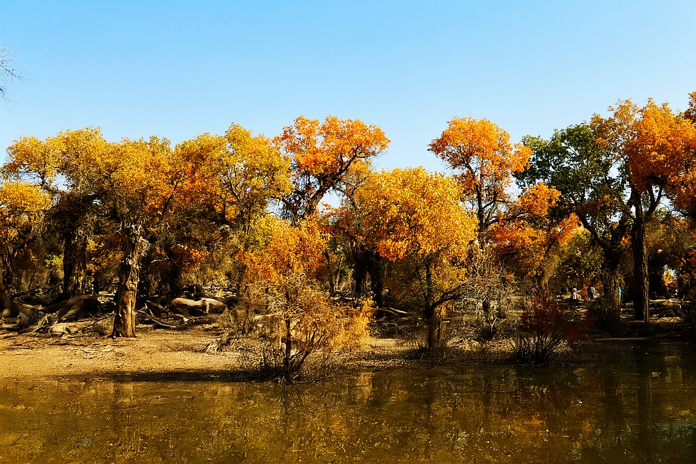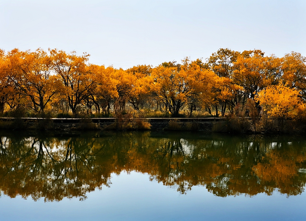 告别喀什,去泽普。这里有2万亩胡杨林。叶尔羌河流经胡杨林景区,一片绿洲,三面环水,形成碧水、金叶相映成趣的景观。此地胡杨,因为有昆仑雪水常年滋润,金色的叶子更有光泽,不像有些地区的胡杨的枯黄色。