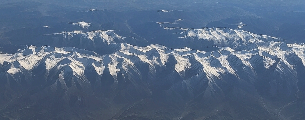 飞新疆一段,飞机很长时间在雪山上面飞,应该是天山山脉。降落[