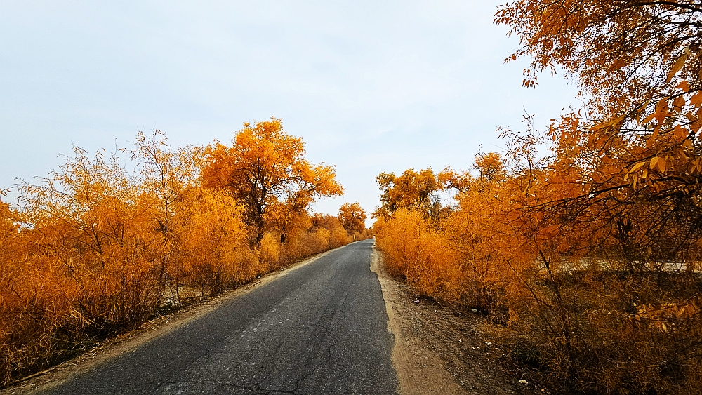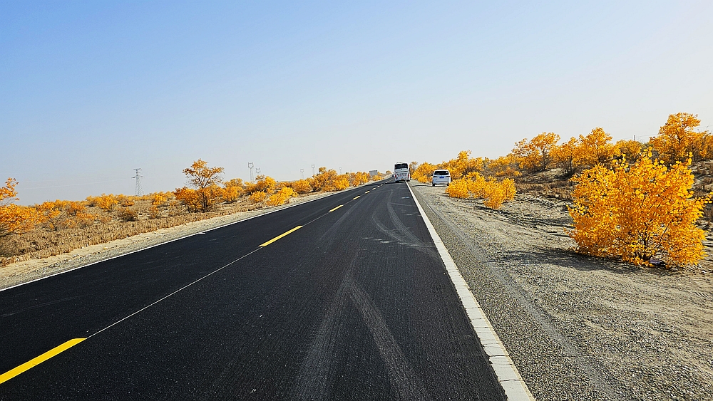 沙漠上的公路笔直。除了大漠风光,不时可看见胡杨林,更好看的是大漠孤树,蓝天黄叶。
