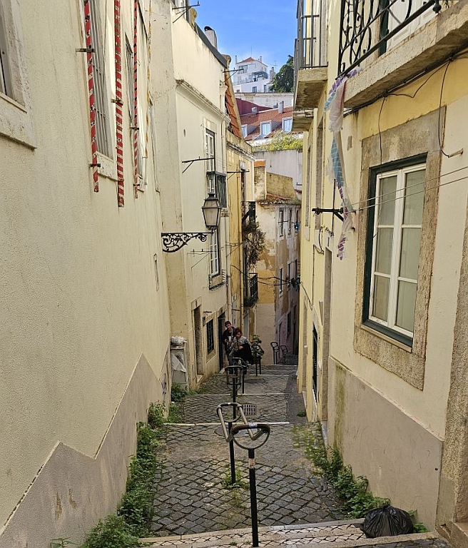 老城区道路都很窄,道路都是地砖铺的。电车在窄巷里穿行。有的地方,行人必须贴墙而站以避让电车。走了几步,就看到了Bica比卡升降机。这是一种小有轨电车比较陡的坡路设置。乘客不多。