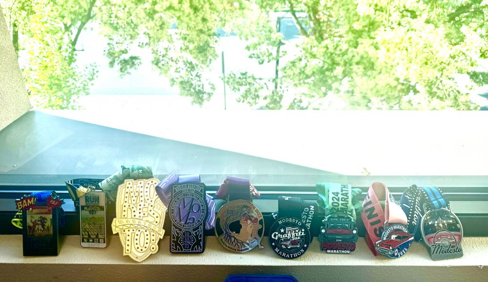 今天把杏花村马拉松的奖牌挂到办公室墙上。看着这些奖牌,有点感慨。