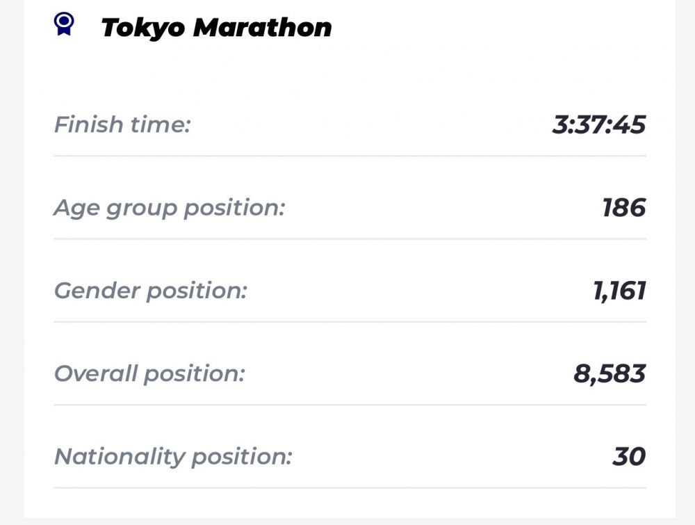说实话日本的软件信息做的不咋样,那个trackingapp一直到马拉松前一晚上才正式上线,到现在都没法看agegroup排名。倒是在abbott六大马网站上可以看到东京马拉松的年级组排名,但是不知道我的年级组有多少人。这次东京马拉松38773人参赛,女子参赛一共10120个人,我在女子总体1161[
