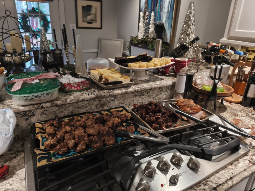 2003年我们搬入了一个大约17家的白人小区,每年的圣诞是邻居们相聚的日子,因为都愿意办爬梯所以通常有三家一起分办甜点主餐喝酒三部,除此外我们对面靠湖的邻居每年独立节组织烟火和炸猫鱼的爬梯。2008年以后美国的经济萧条影响后圣诞就改为两家,以后更减至一家,这里是2016年的圣诞节的几张照片