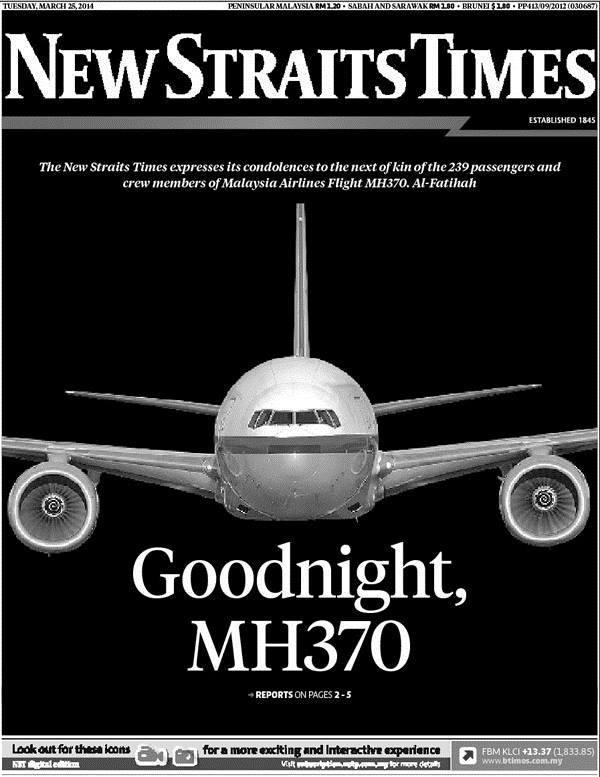 马航370失联404小时,等来最坏的消息“机毁人亡”。世界各大报纸包括中国很多地方报纸闻讯第一时间头版套黑刊登了这一消息。那些煎熬等待,心存不幸之万一的亲人们瞬间崩溃,多人当场昏厥。网上愤怒,质疑,哀悼的帖子铺天盖地。有个帖子写道:向所有版面套黑的报纸致敬!人同此心,生命无价,鲜活的生命莫明奇妙的丢失了是所有人的痛。不想装什么,也不想[