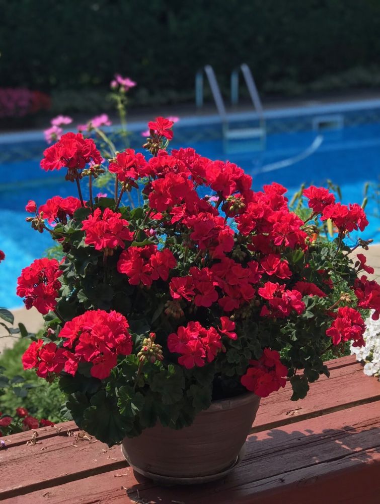 天竺葵是一种既美丽又好养的大众化花卉。每年花苗上市的时候,在多伦多的gardencenter可以见到各种各样的天竺葵。大多数人都把它当作一年生草本植物,到了秋天就任其自生自灭了。岂不知它是多年生半灌木植物。秋天下霜前把它搬到室内向阳处,它依然会给你带来满室春色。来年春天搬到花园里,经过脱胎换骨(脱旧叶换新叶),花儿开得更繁茂。我的经验如图:这棵红[