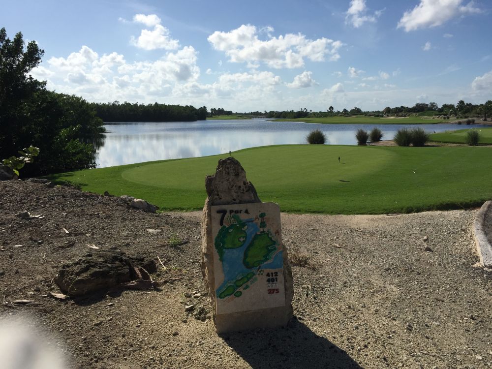 在新年那天,我自个去坎昆的高尔夫球场打了一场球。那天,坎昆的天上万里无云,骄阳似火,如夏日蒸烤。我当时没有晕倒,但是晚上却是上吐下泻,必是中暑后反映。另外,我去的那个球场(Rivera)在水道中穿行,鳄鱼常趴在路边。那天因为是元旦,球场上人少,还真有点胆怯。最大的失败是因为球技不高,很多球都掉到水里去了。到第十八个洞的时候,我已经没有球可打了[