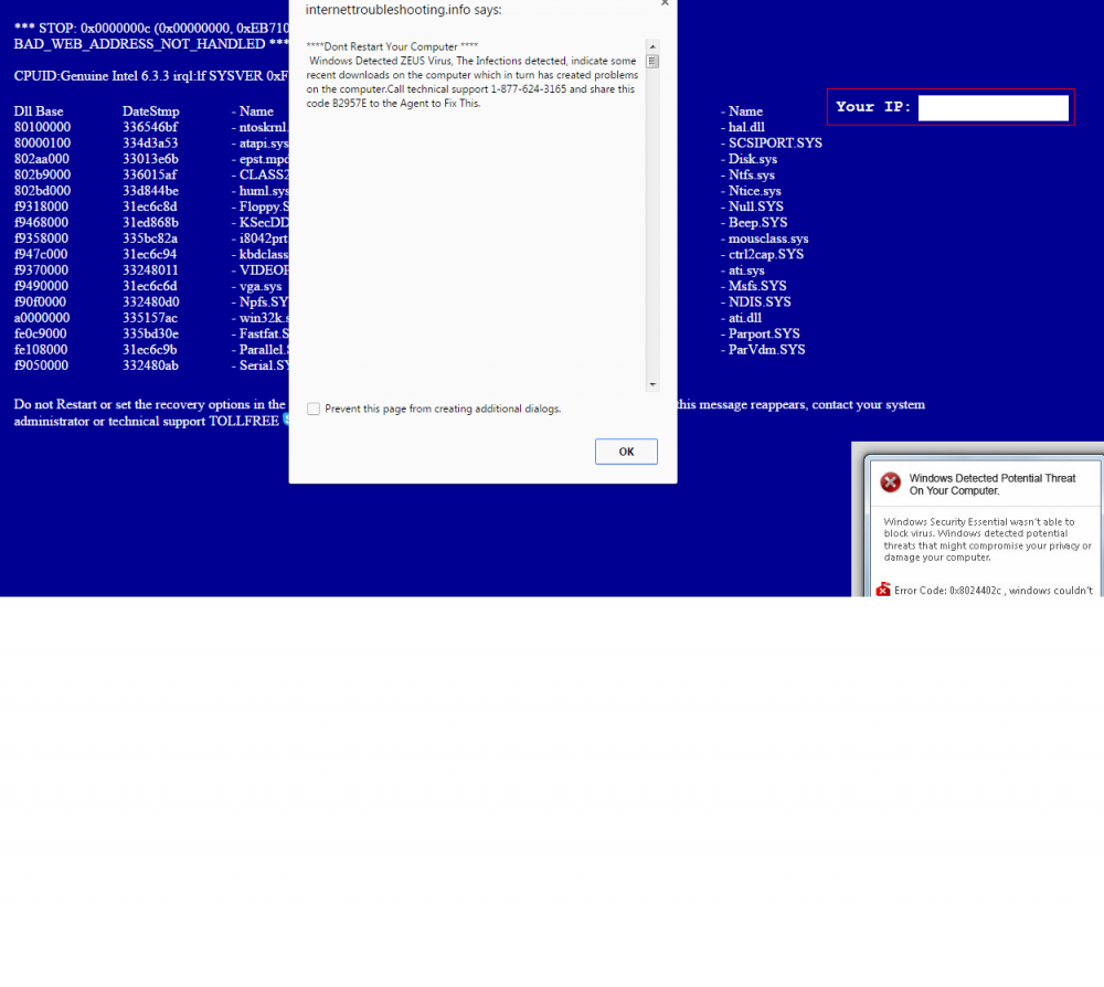 飞哥:警惕阿三的诈骗新招--不要上当网络诈骗可以说是道高一尺,魔高一丈。聪明的阿三新招频出。差点儿让猴精的飞哥中招!正在网上神游,不知动了那根筋,突然跳出蓝屏警示,还不停地发出警告,停不下来,声音很大,只好关掉喇叭。所有网页完全瘫痪。如图警示。吓得够呛。提示要打Windows的服务电话1-877-624-3165,说是ZEUSvirus,Code为B2957E。如果不修理,将会安全受损[