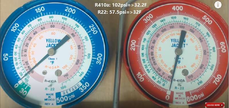 低压低于0C/32F(R410a低于102psi或R22低于57.5psi)意味着气管结冰,原因可能是通风不足风扇不转、冷媒缺乏或管内脏堵。https://www.youtube.com/watch?v=uEs99SSKjgE