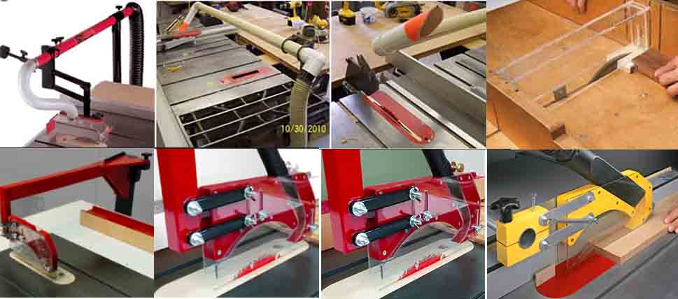 台锯的上/后/下都可吸尘。上臂可如图水平旋转销子锁位(紫红臂),臂可用PVC()白橙臂)固定在锯的右侧,吸尘口用平行四边形铝条上下移动,,进料口呈斜面或加滚轮。