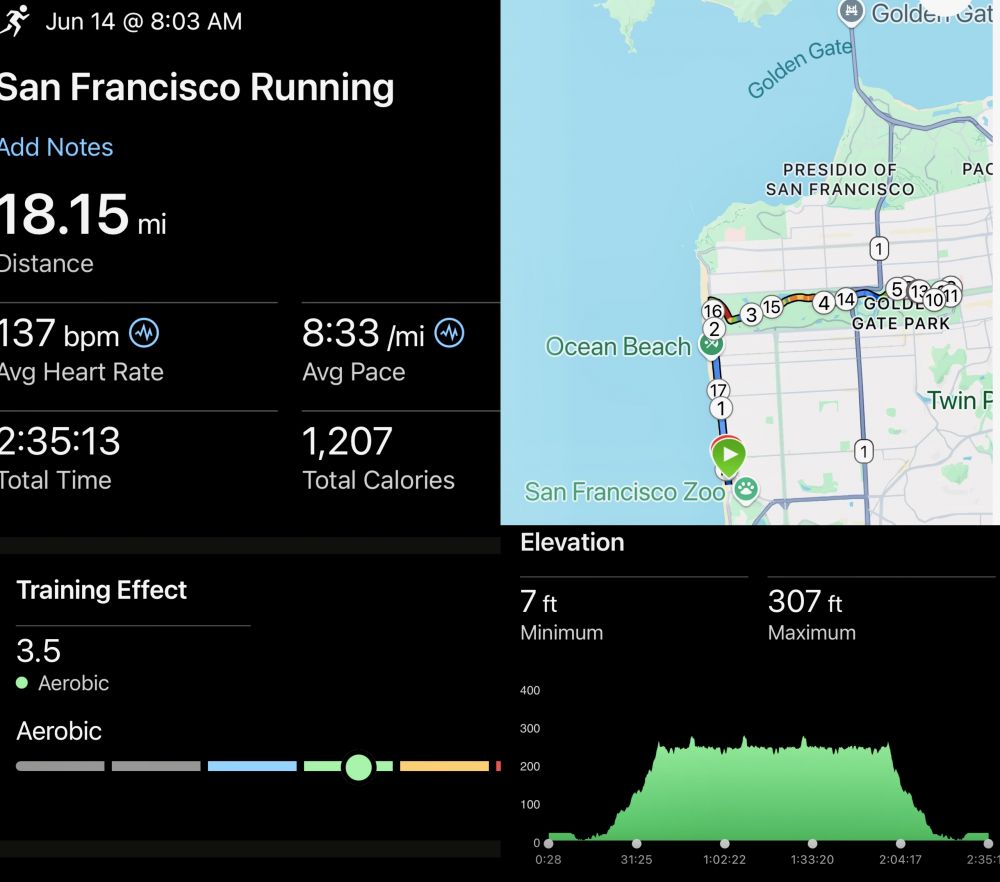 照片1:昨天周六是我训练玫瑰城马拉松的长跑日,我在旧金山湾海洋海滩和金门公园跑了18.15英里。其实,昨天的训练计划是18英里,但因为周日15号是父亲节,我就多跑了0.15英里,含15,提前庆祝先生和女婿父亲节快乐!也提前祝天上人间所有父亲们节日快乐!