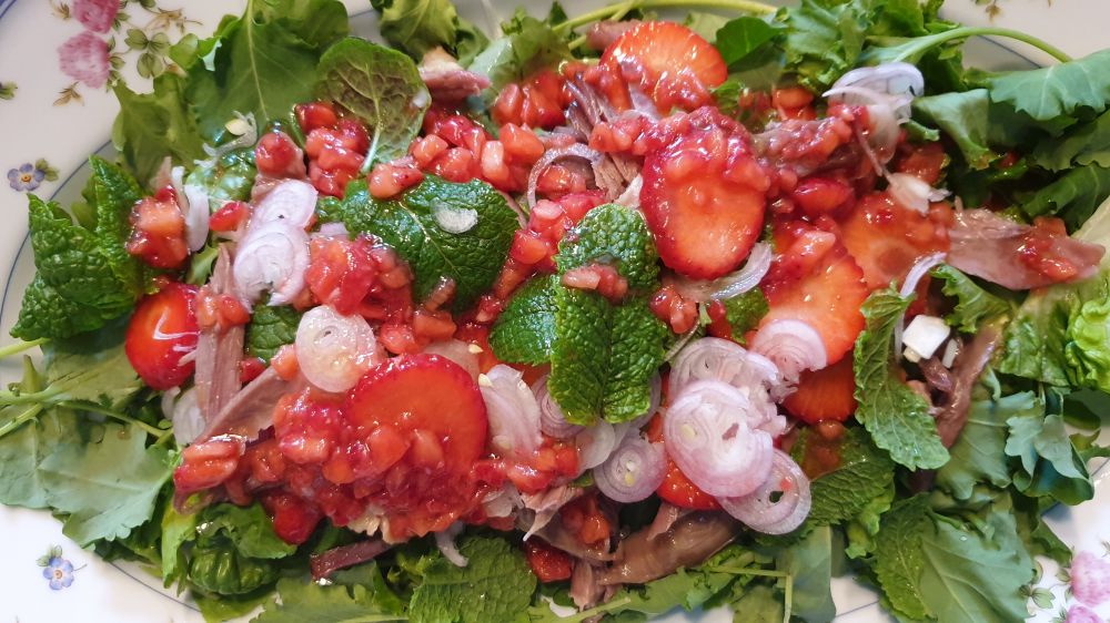 初夏的本地草莓草莓酸甜诱人,配鸭肉入菜去腻开胃。材料:油封鸭(也可以用鸡肉)、红葱头、草莓、薄荷叶、红酒醋、橄榄油、绿叶菜、盐和胡椒。2-3颗草莓切碎加一茶匙糖,放置10-15分钟。草莓变软出水,然后加入2茶匙红酒醋,拌匀,再加入两大勺橄榄油拌匀,色拉酱就准备好了。油封鸭放入180℃烤箱10-15分钟,也可以放平底锅加热。热好后拆骨取肉放在绿叶生菜上,撒[