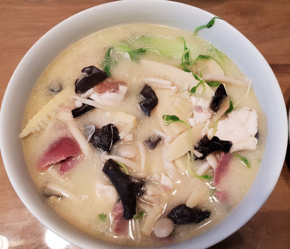 我做的不少菜都是先在餐馆或者别人家吃过,然后凭记忆做出来了。有时由于缺某些材料,就用可以买到的材料代替,逐步就演化成了一些新菜。第一次做这道菜以前,以为自己没有吃过,只在油管上看到了一个视频,“豆浆煮江团(鮰鱼)”。这里是买不到长江鮰鱼的,就用金平鲉(英语rosefish、荷兰语roodbaars)代替。虽然做以前以为自己没有吃过这道菜,做好以后竟[