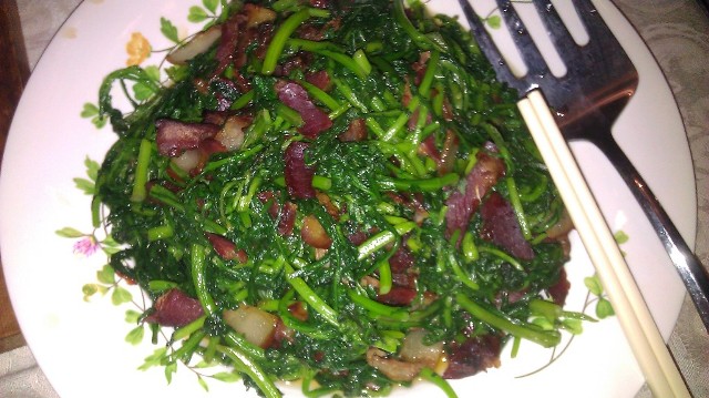 我做的七道菜中,茼蒿炒腊肉最先被吃完。这道菜做法十分简单,茼蒿洗净切段,腊肉改[