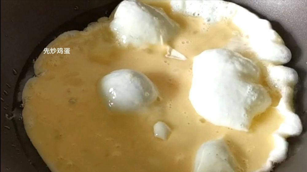 1、三只鸡蛋打散,炒成蛋粒备用。