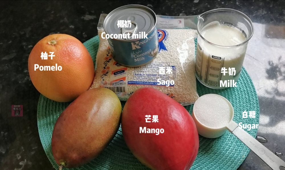 芒果3只,柚子1/3,西米100克,椰奶200毫升,鲜牛奶300毫升,清水150毫升,白糖60克。