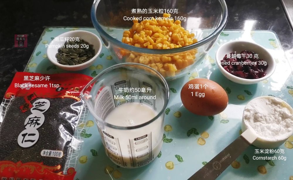熟玉米粒160克,蔓越莓干30克,南瓜籽20克,玉米淀粉60克,鸡蛋一个,鲜牛奶约50毫升,黑芝麻1茶匙,白糖一茶匙。