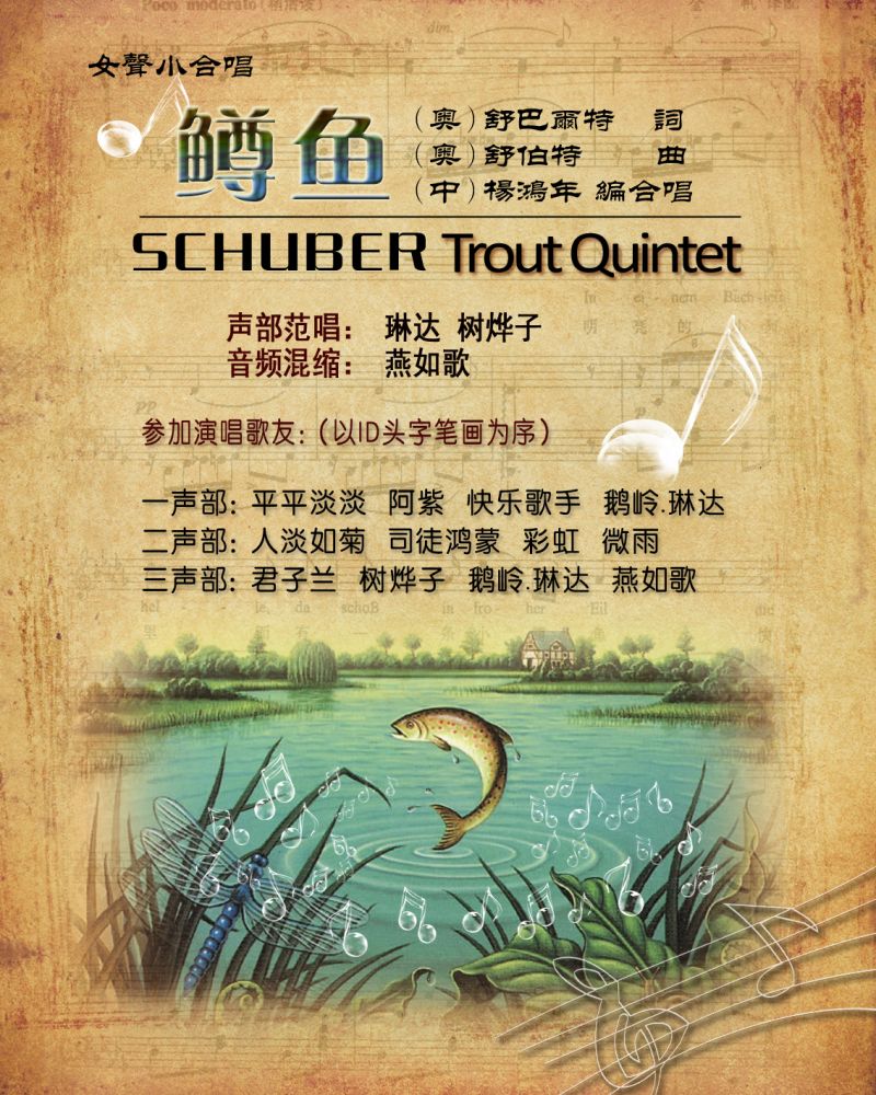 感谢如歌邀请,我很荣幸与许多歌唱高手姐妹们合作演唱了这首舒伯特曲杨鸿年大师改变的合唱曲《鳟鱼》。好久未上唱坛,仅借此歌问好各位新老朋友!!