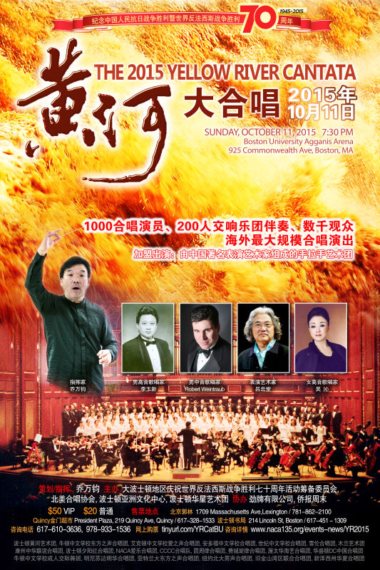 为纪念中国人民抗日战争暨世界反法西斯战争胜利70周年这一重大历史性的胜利,纪念正义战胜邪恶,光明驱散黑暗,由北美合唱协会会长著名指挥家乔万钧策划指挥,北美华人合唱协会NACA主办和来自美国麻省,康州,费城,新泽西州,加州,加拿大,中国国内等二十多个合唱团近八百名合唱团员,近二百人的大型专业交响乐团将于10月11日晚7:30在能容纳6500观众的波士[