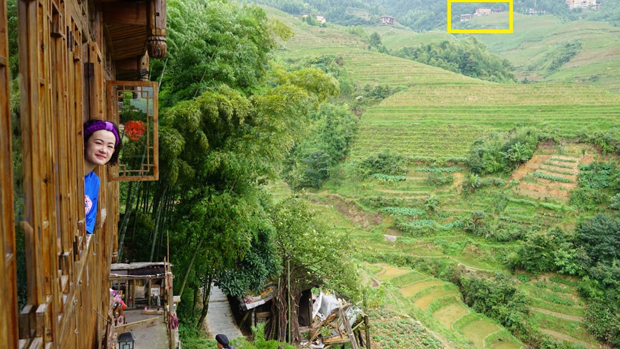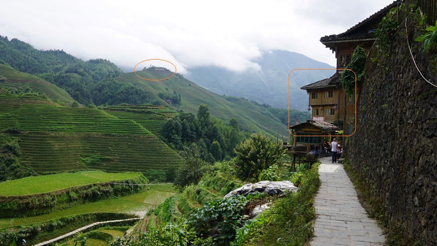 我们一行数人刚放下行李又匆匆踏上了去三号观景台的山路。从下面的图可以看到三号观景台(圆圈圈着的)和我们住的天然居客栈(方形围着的)你觉得距离远吗?