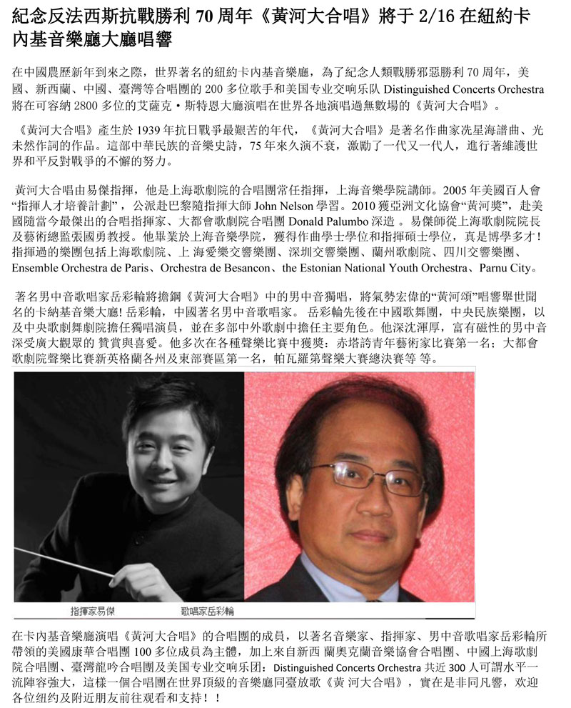 二月16日中外闻名的黄河大合唱在卡内基音乐大厅唱响。作为康华合唱团的成员我很荣幸继2012岁月甘泉再次登上卡内基大厅的舞台与来自新西兰,上海,台湾和美国其他州的歌唱爱好者一起引亢高歌黄河。