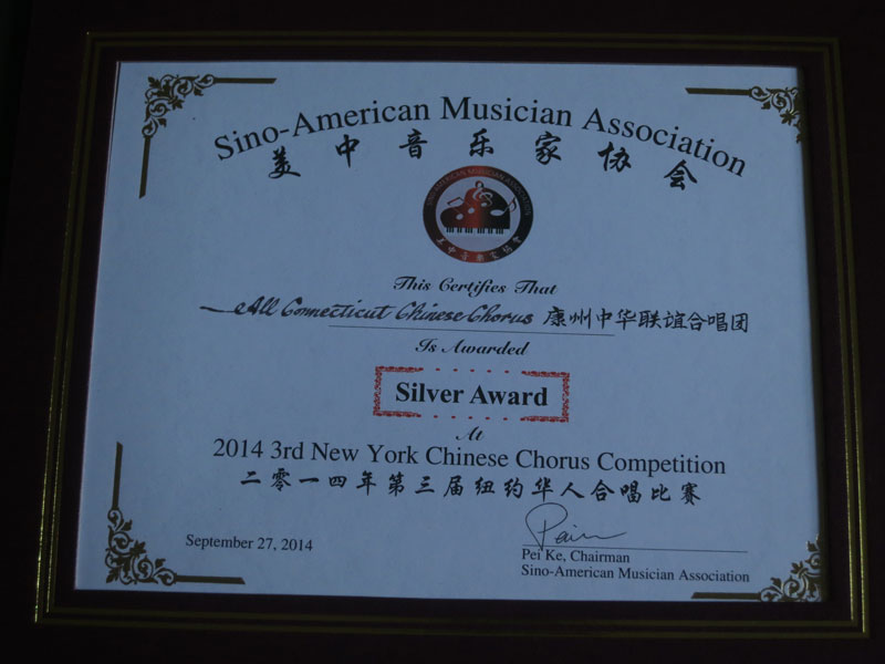 昨天作为康州中华联谊合团的成员我参加了第三届纽约华人合唱比赛,很高兴获金得银[