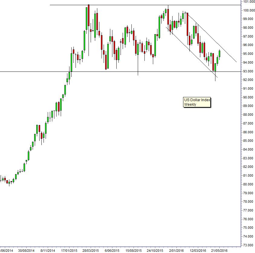 有网友建议俺谈论美元的走势和波动区间,其实俺之前都有在谈论金价走势时谈到美元的走势和波动区间。特地从CNBC.COM找了一张美元指数的走势图来说明。美元指数的支撑线是93,压力线是100.6。从年初到现在,俺技术面分析是形成了一个向下的通道。趋势通道的上限,目前大约在96。下线大约在92。若是突破96,美元指数就突破“向下趋势”,有可能继续上涨,再次测试[