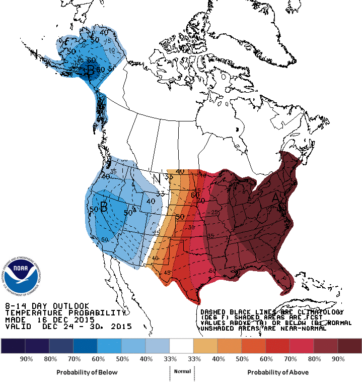 昨天下午东部3:30NOAA更新的天气预报图显示全美气温朝向利空发展,东部和南部地区在未来6-14天回暖而且气温分布概率比正常高。可是为什么天然气反而开始从大跌底部反弹呢?