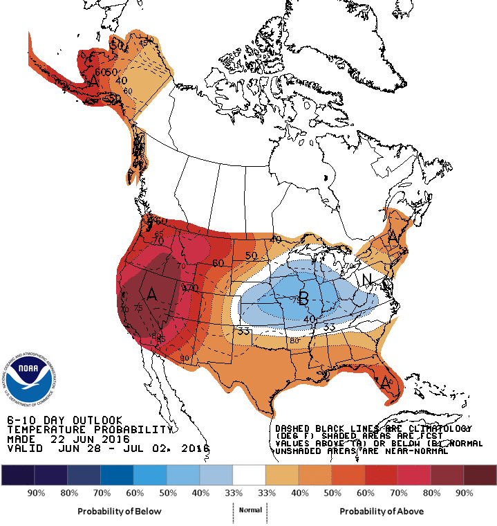 近日天然气暴涨的原因令人迷惑。根据华尔街日报昨天的分析是技术面买进(TechnicalBuying)和预测未来两周气温偏热利多所导致。技术面买进(TechnicalBuying)主要是昨天天然气价格突破了布林区中线,或均线,导致空头补仓改做多等云云。至于关于气温预报偏热,这一点并没有多大的证据。根据NOAA,AccuWeather,和Weather.com未来14天的气温并没有明显偏离正常。所以华尔街日报的理[