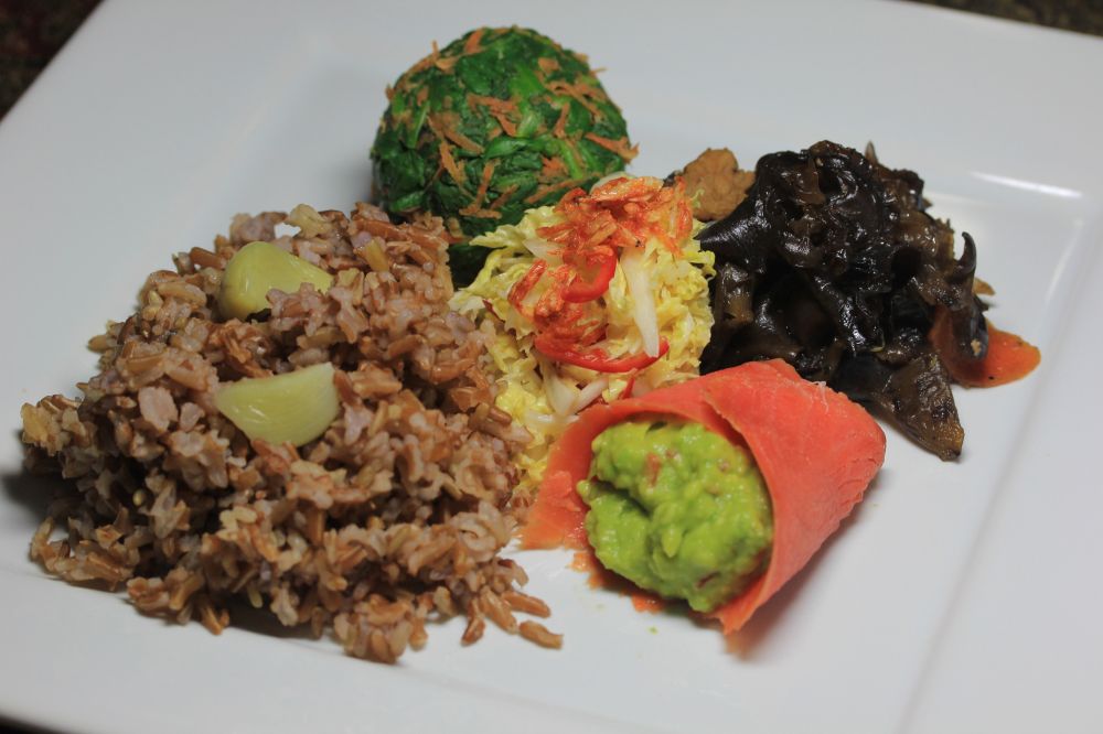 菠菜球--把菠菜叶子用热水焯一下沥干,切小块,胡萝卜搽细丝,加上黑芝麻[