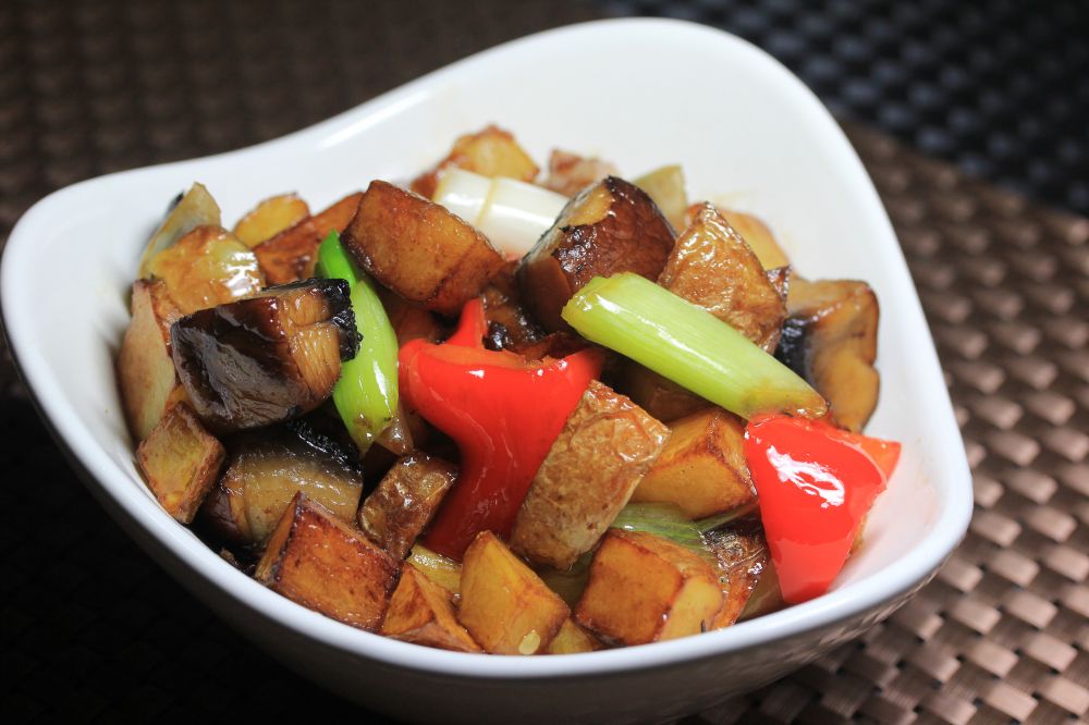 用料:油,花椒面,盐,酱油,糖,蒜末,大土豆一个去皮切小丁,洋葱一个切小块,茄子适量,切[