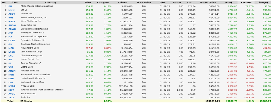 https://blog.wenxuecity.com/myblog/55169/202501/12085.html表现最差的是去年表现最好的几只股票。芯片股由于受到DeepSeek的影响,下跌幅度最大。其它股票中规中矩。声明:非投资建议。完全是为了拉风搞的试验田。[