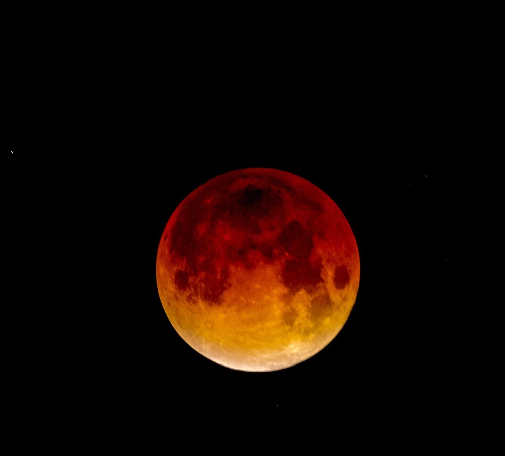 今天是元宵节,正好赶上日全食--血月亮。一句话,好巧。我半夜三点钟起来,这时还不是日全食,大约有20%的月亮没有被地球遮住。我不敢到门外去看,怕街上有坏人,哈哈。我不敢到后院去看,怕院里有动物,哎呦。胆子又小又想看就只有在屋里往窗外看,月亮升的很高,比昨天晚上小了很多,但是却像血一样红,我一时感到害怕,这月亮怎么这么红啊。真是有些chilling。[