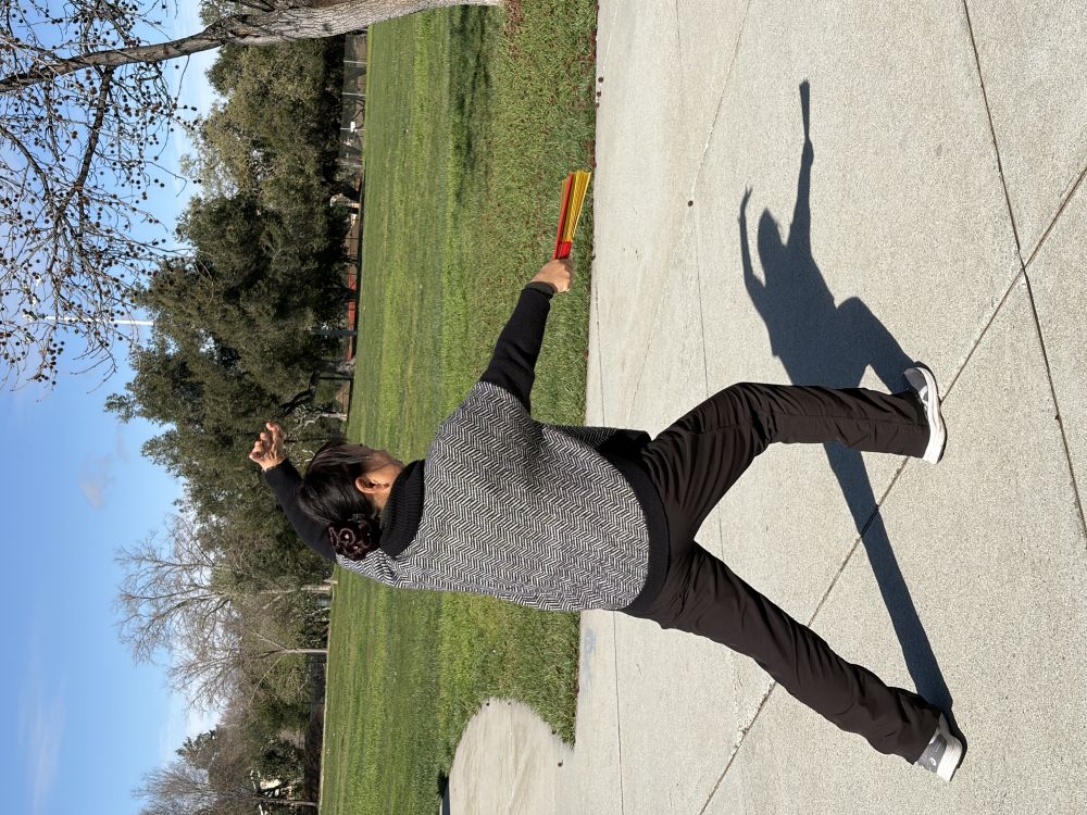 今天在公园和朋友为明天的春节聚会排练太极功夫扇