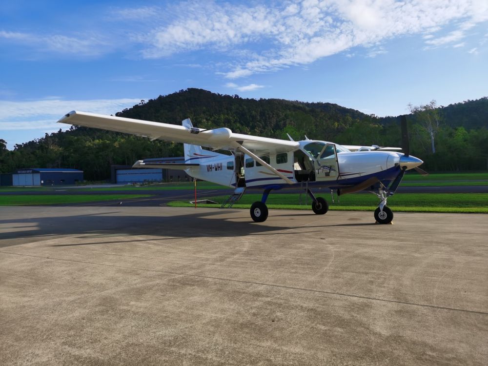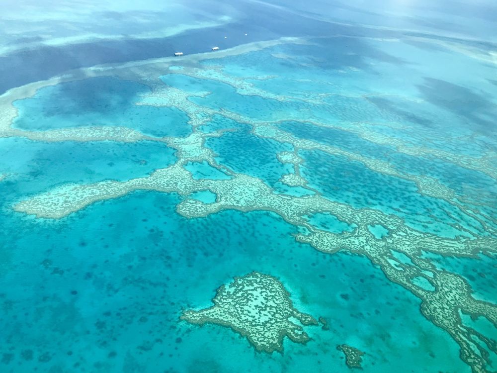 今天是我们整个澳大利亚行程最重要的重头戏。老天爷特别照顾我们,清晨一睁眼凉台外一抹朝霞,昨天的乌云一扫而空,整个天空一片清新。我们今天参加的是包括飞机观光、快艇出航、希尔山观景、白色天堂沙滩游玩、圣灵岛浮潜等项目的一日游套餐。旅行社的汽车早早来到旅店接我们,6点半就抵达出海的小飞机场。每个人要求称体重,然后由飞行员按照重量分配座位。[