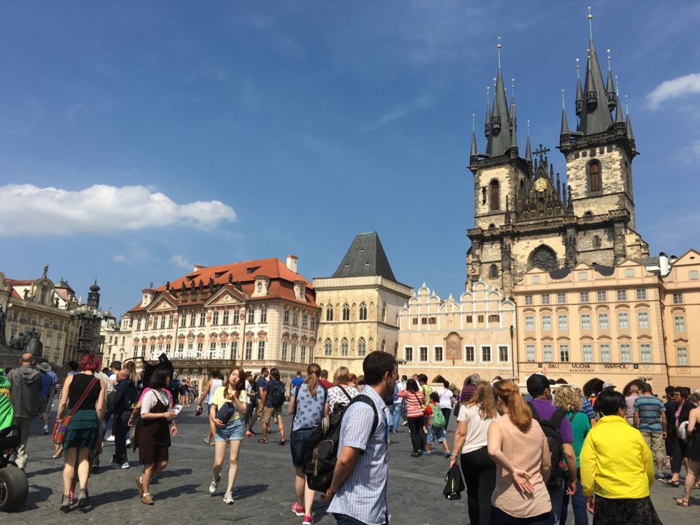 从城堡山下来,再次跨过查理大桥,伏尔瓦塔河东岸便是老城区。向东穿过迷宫般的青石板街巷,很快来到老城区的中心地带,老城广场。老城广场是布拉格历史上最著名的广场,已有900多年历史,11至12世纪这里是中欧贸易最重要的集市之一,这里也是决定国家历史命运的政治事件发生地,见证了众多的历史事件。广场上游人如织、熙熙攘攘,来自世界各地的游客都集中在这[