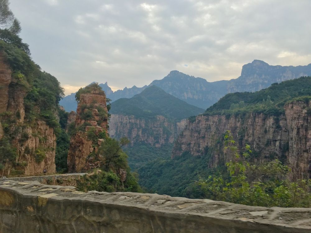 由于要赶中午的火车,七点半吃完早饭我们准时向着南坪出发了。南坪是万仙山景区的景点之一,由11个自然村落组成,每个村庄都很小,最小的只有三户人家,一座座石房石屋点缀在山中的沟沟坡坡里,是太行山的特色。汽车沿着盘山公路下山,山路曲折艰险,窗外是红色的绝壁山崖。昨天导游介绍说,万仙山中有好几处世界级的攀岩场地,眼前一座孤立的石峰,犹[