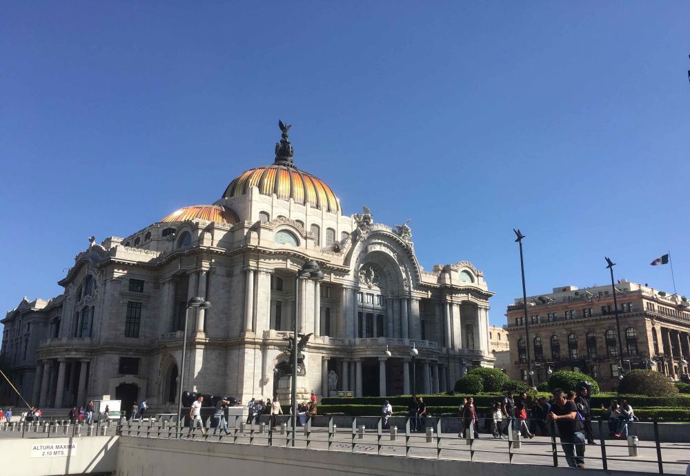 继续向前我们来到这座美丽的艺术宫(PalaciodeBellasArtes),一反公园的冷冷清清,艺术宫前聚集了许多人。艺术宫于1904年开工,本是为纪念墨西哥独立100周年(1910年)而建,可由于各种原因直到1934年才完工。艺术宫为新古典主义风格,走进艺术宫,大堂精美气派。楼上是艺术博物馆,星期日免费,每人省了30披索。我不由有些感叹,墨西哥一个并不很富有的国家,所有博物馆的[