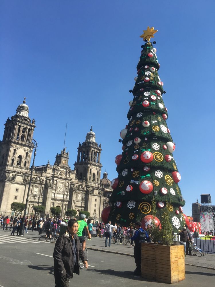 走出艺术宫我们拐进小巷子继续向前,街上挤满了行人,熙熙攘攘,接踵比肩,大家都朝着一个方向,前面那棵巨大的圣诞树。来到街口,眼前的视野开阔起来,一个宽阔的广场中矗立着一棵巨大的圣诞树,旁边是那面据说是三层楼高的国旗,到处挤满了游人,四周的建筑都扮上节日的盛装。这就是宪法广场又称索卡偌(Zocalo),是墨西哥政治[