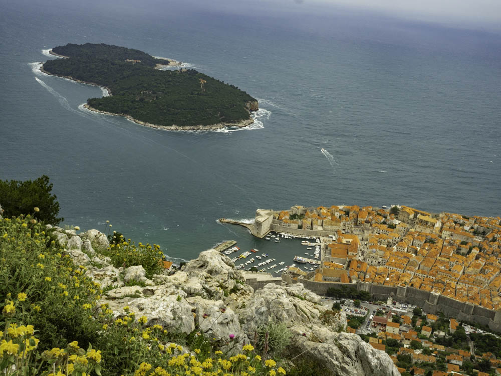 从涅母到克罗地亚的杜布罗夫尼克(Dubrovnik)很近,出入关也简化了,一起完成,1小时即到杜布罗夫尼克老城。那天风大缆车停运,我们随导游座出租车上山,上山的路窄且陡,弯也急,记得有一处几乎180度的急弯且是上坡,车冲的很吃力,动力不足的车真不建议上去!但上山是绝对值得的,山上野花成片,从山顶可俯瞰杜城全景,欧洲风情、鲜艳夺目的红屋顶自不用说,古城[