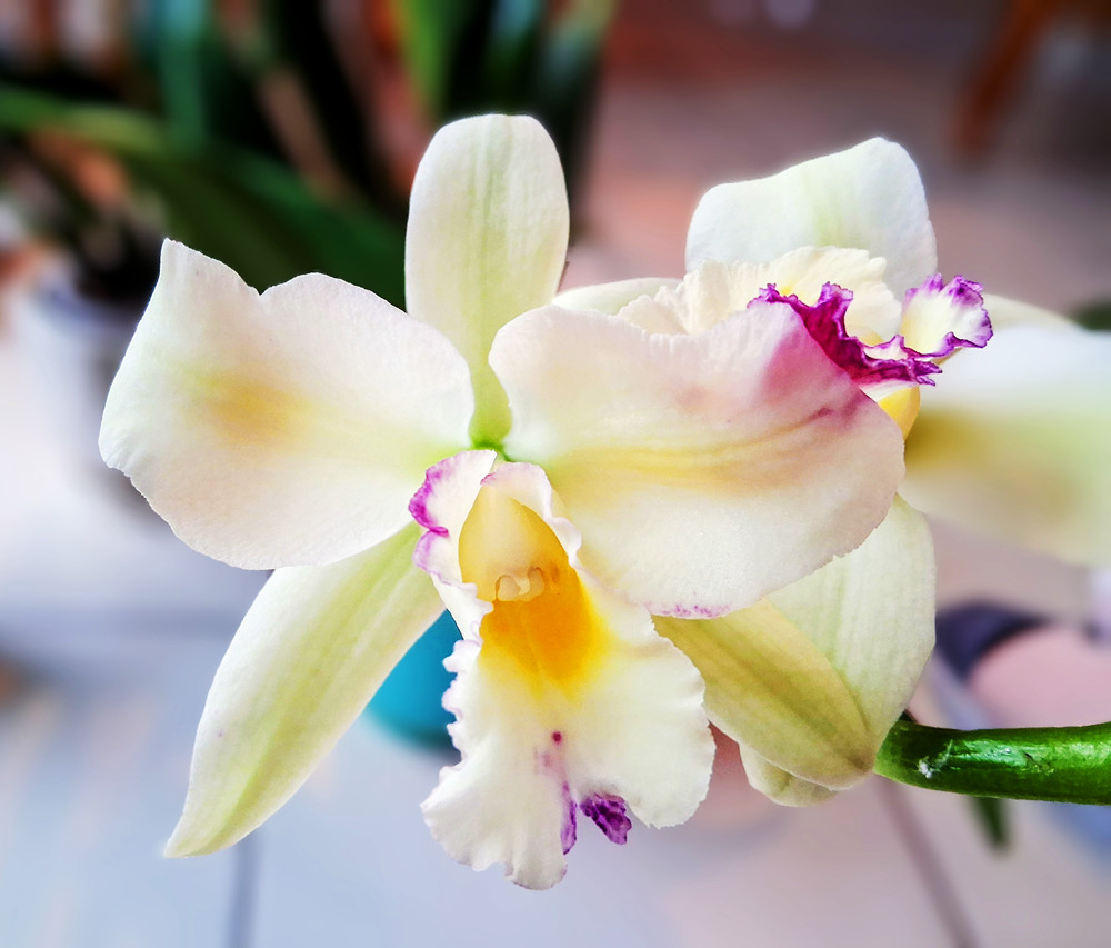 第一盆这个已经开了将近一个月的花了,这是很漂亮的一个卡特兰杂交品种,暂时找不到它的名字。它最漂亮的地方是它的唇瓣,唇瓣上面有一点玫红,还有一点橙黄。这样配上它非常素雅的花瓣,这朵花就特别生动,特别可爱,仿佛它虽然不艳丽,但是它的心中也装满了热情和浪漫。这一[