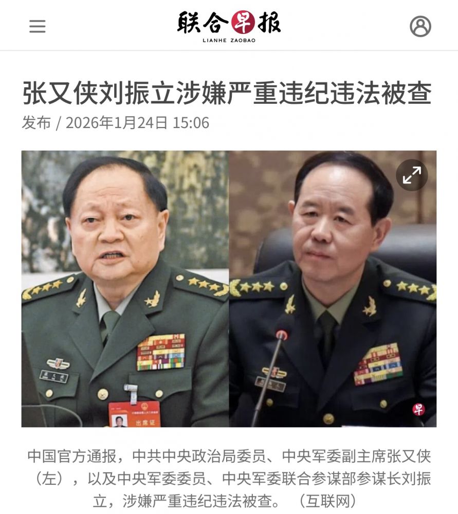 先谈点即刻新闻,中央军委第一副主席张又侠和解放军总参谋长刘振立被抓。海外广泛谣说他们要政变,与猫儿在殊死搏斗,现在似乎结果出来了。