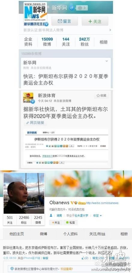 新华社提前1小时宣布伊斯坦布尔获举办权,事后新华社说是技术错误,当时第一轮投票完了,日本直接进最后投票,然后马德里和伊斯坦布尔争剩下的一个名额。第二轮投票,伊斯坦布尔胜出,央视这个傻鸟就以为日本被淘汰了,结果却是东京要和伊斯坦布尔争最后。