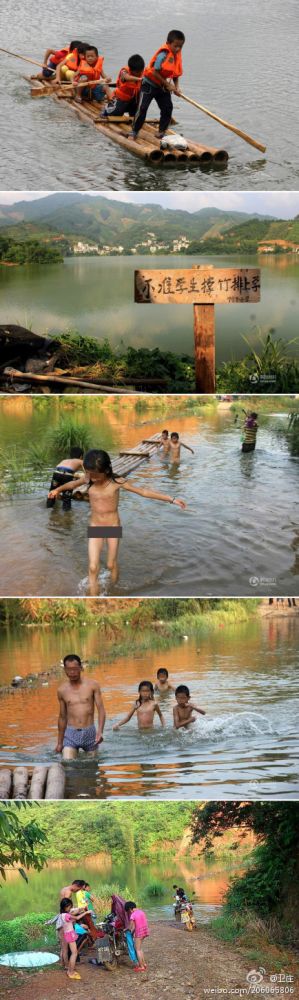 第一张图,是广西藤县的学生,撑竹筏上学。第二张图,是事件曝光后,三十年无人问津的问题马上得到了当地高度重视,立了块牌子,不准孩子们再撑竹排上学。后面图,不能撑竹排了,现在孩子们上学,只能在家长带领下,脱了衣服涉水过去。