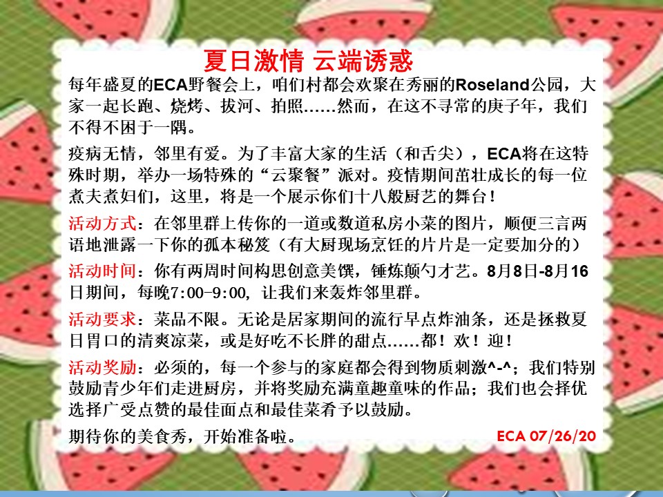 为了丰富疫情期间村民的生活(和舌尖),我们村的村委会ECA(EdinaChineseAssociation)在此特别时期,举办了一场以“夏日激情云端诱惑”为主题的“云聚餐”。
